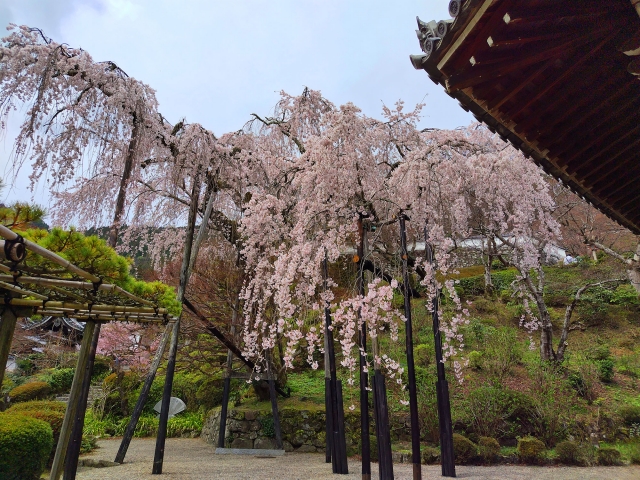 善峯寺には彼岸桜や山桜など多くの桜が見られますが、桂昌院お手植えの枝垂れ桜は経堂の西側で荘厳な美しさを誇っています。もみじの古木と絡み合った珍しい結び木で樹齢300年以上の名木。