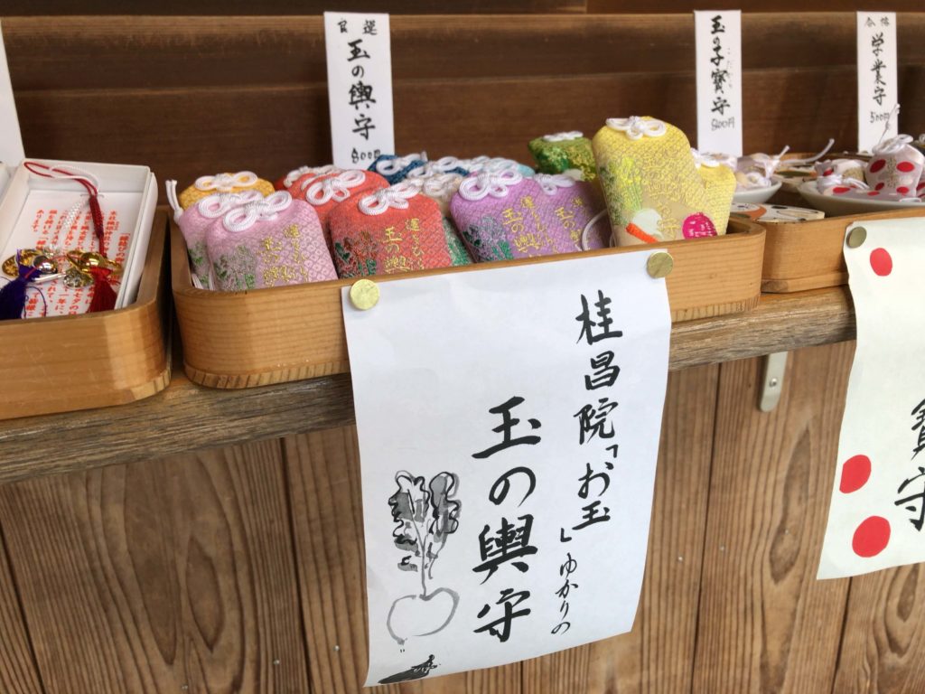 青物屋の娘・お玉の『玉の輿伝説』にちなんで、西陣織の布に京野菜の柄が刺繍されているお守り。玉の輿だけでなく、良縁・金運・出世・開運にご利益があるとされています。