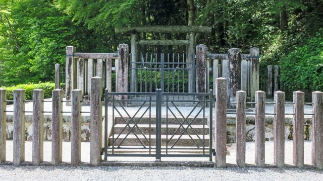寂光院の門前にある石畳の陵墓径を上がって行ってください。その先には建礼門院徳子大原西陵があります。出家していたこともあり、鳥居の中に五輪塔がある珍しい仏教式御陵とさ れています。