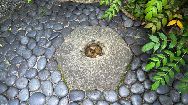 京都の中心を表していると言われているへそ石は、中央に丸い穴が開いている六角形の石。平安京増設時に本堂の位置に道を通すために勅使が祈ったところ、堂が北の現在地に移動し、もとの位置に石が一つ残ったという伝説から『本堂古跡の石』ともいわれています。